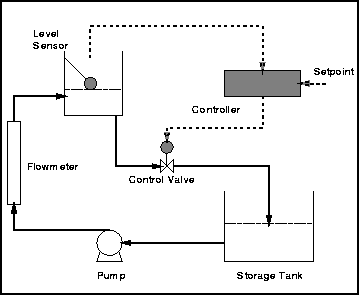 The level is controlled via a feed-back control loop. Its main feature is to directly measure the value of the controlled variable, in this case the level, and feed the signal back to the controller. The controller will compare the measured value to the setpoint. When an error is detected, the controller will take action to adjust the manipulated variable to eliminate the existing errors.