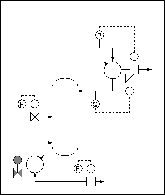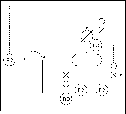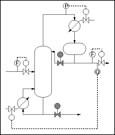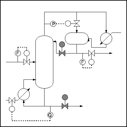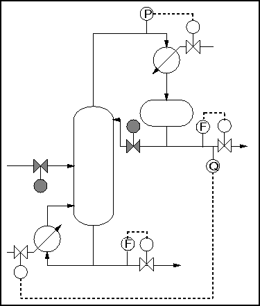 So the number of degrees of freedom is 5. However, a typical control strategy for such a process would use only 4 of these - feedrate, column pressure, top and bottom composition. This is because the column and condenser are normally maintained at the same pressure.