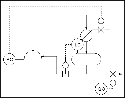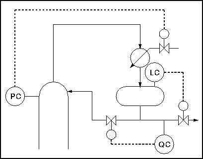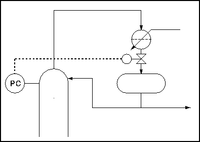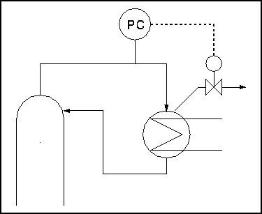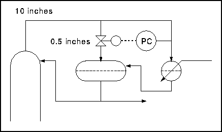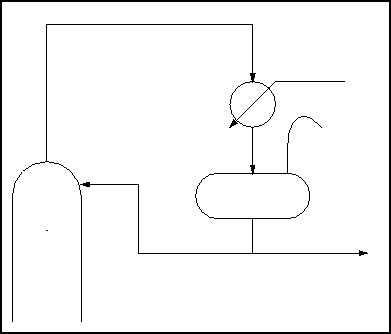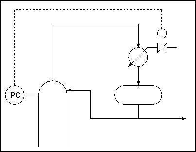 The first thing to notice about this setup is that the reflux drum and condenser are at the same level. The second important point is that the vapour line, on which there is the control valve, is very small in comparison with the overhead line. If the valve is opened there is a small escape of gas into the reflux drum. This pushes the liquid level down in the drum and up in the condenser, flooding it and reducing the heat exchange area as in the last example.